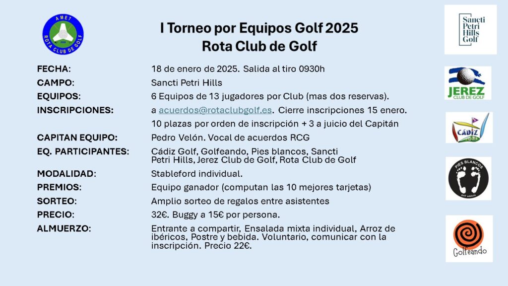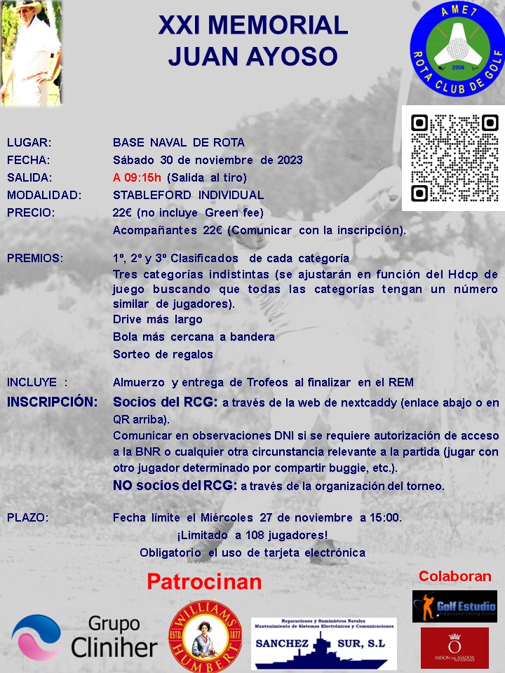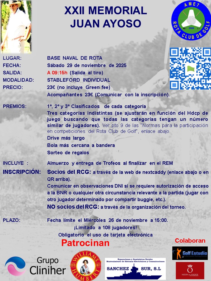 Nota de Prensa: El sábado 29 de noviembre 2025, el Rota Club de Golf celebró en el campo de la Base Naval bajo la modalidad stableford individual el XXII Torneo Memorial “Juan Ayoso” en recuerdo del que fue profesional de Golf de esta provincia, al torneo participaron numerosos miembros de la familia Ayoso.